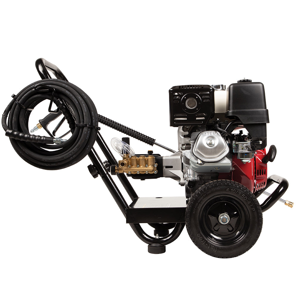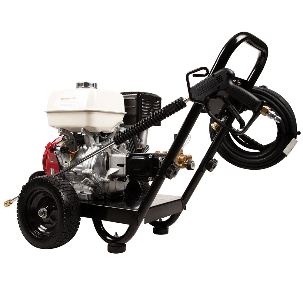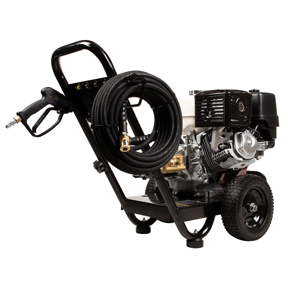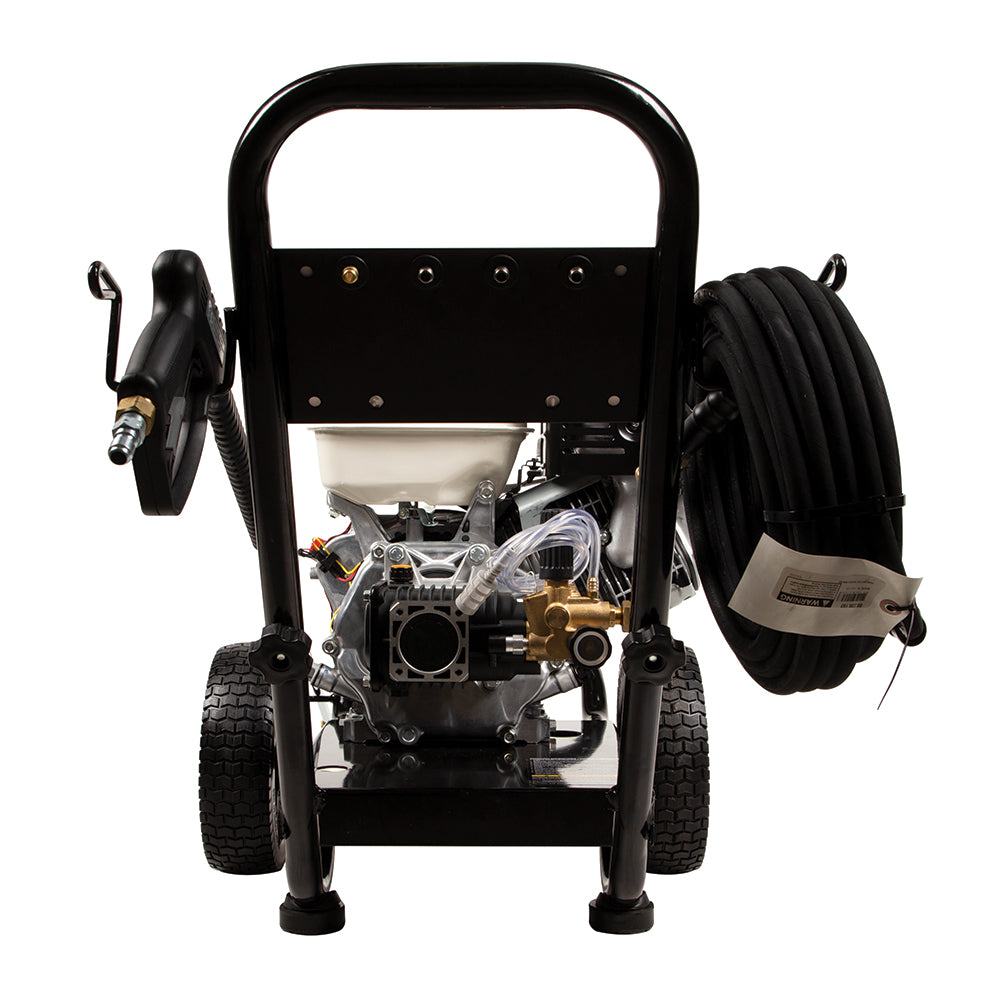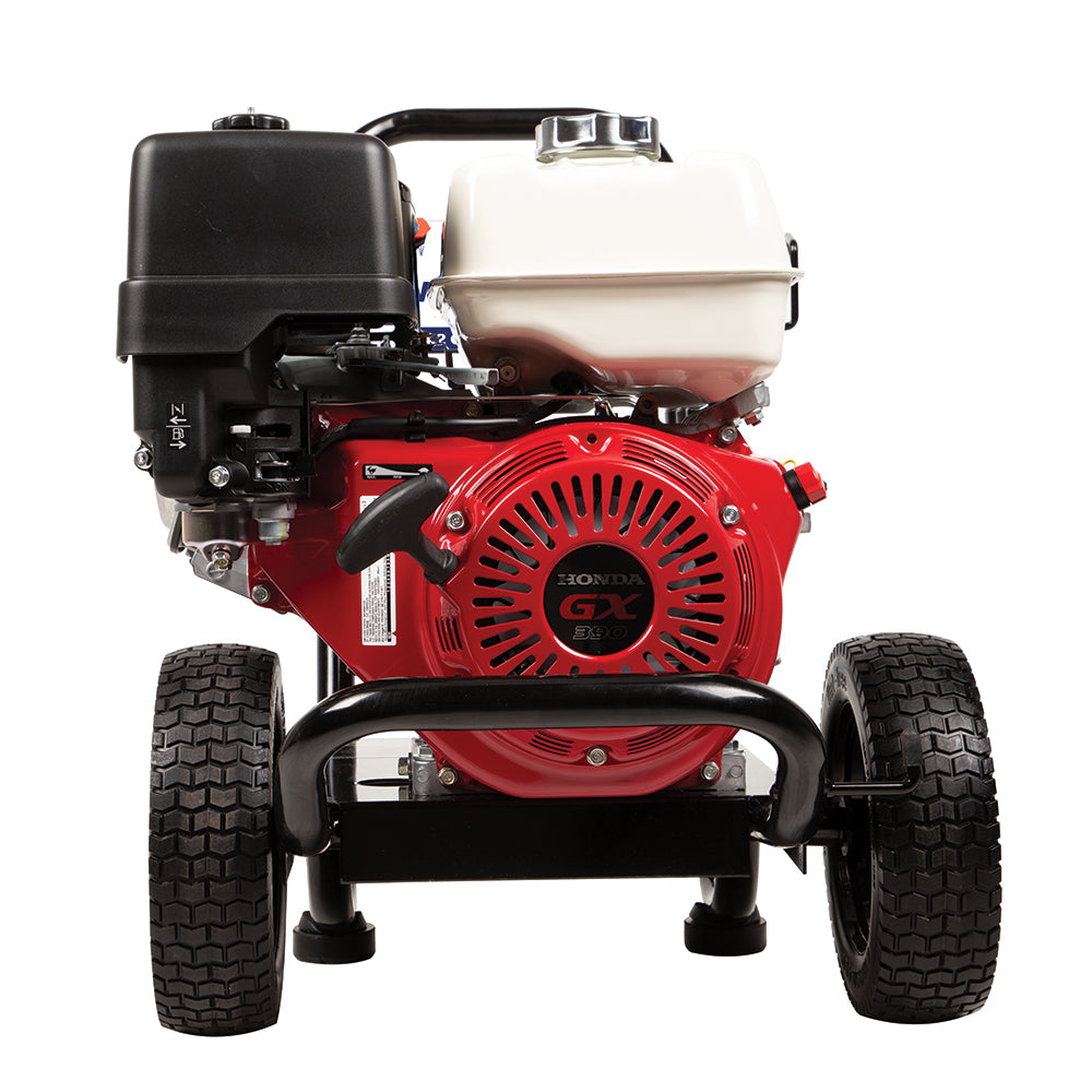 Maneuvering a heavy-duty pressure washer on rough terrain can be a challenge—unless it’s equipped with 10″ flat-free tires and a rugged steel frame like this one.